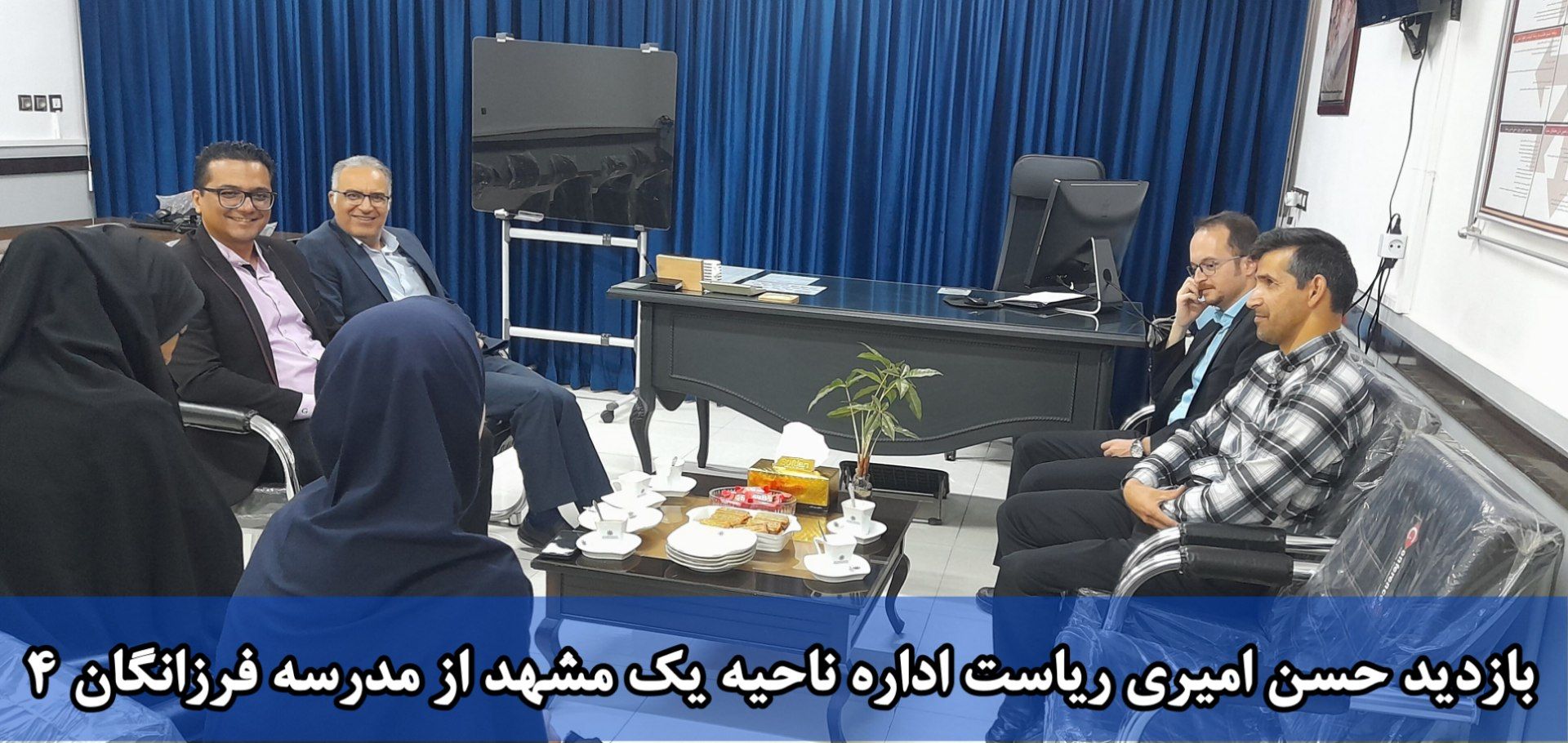یکشنبه 17 فروردین جناب آقای حسن امیری ریاست اداره ناحیه یک مشهد به همراه جناب آقای مجتبی خسروی معاونت پرورشی و تربیت بدنی و جناب آقای اعظم نور کارشناس مسئول متوسطه دوم از مدرسه فرزانگان 4 بازدید کردند و ضمن عرض خداقوت مشکلات ومسائل همکاران را از نزدیک جویا شدند.